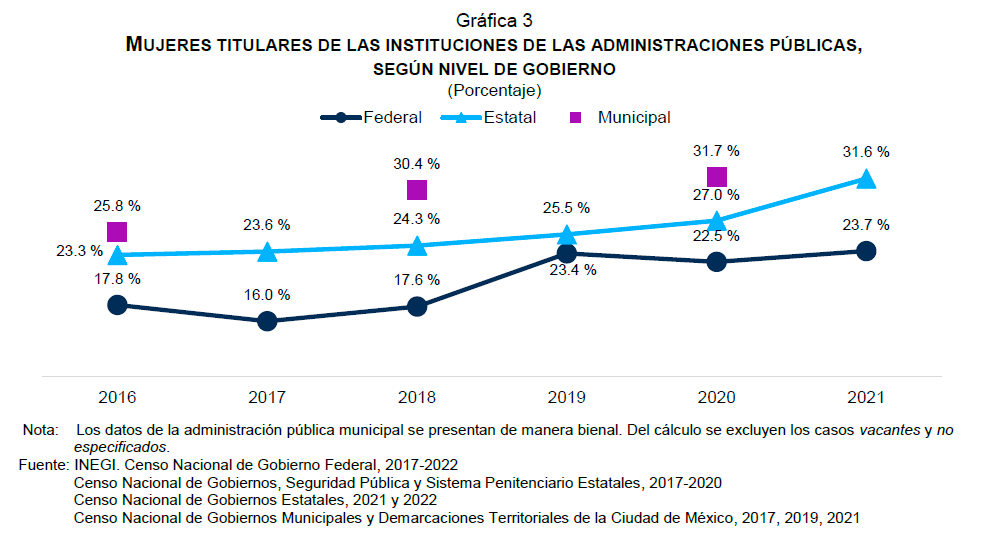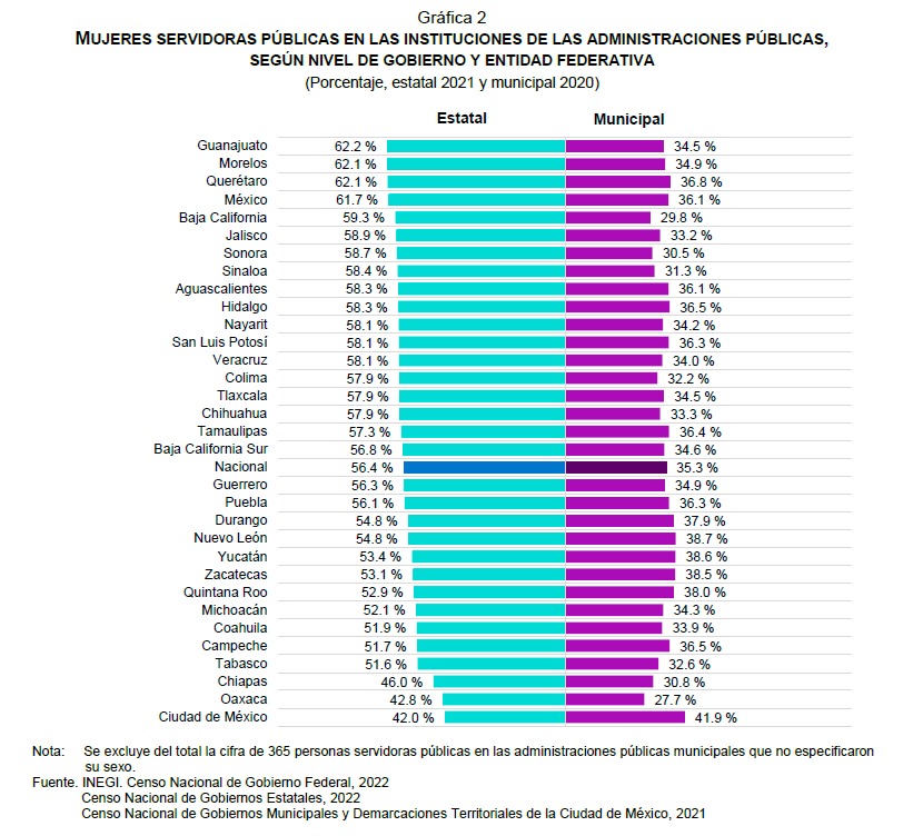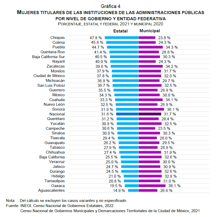 A nivel estatal, en 2021, destacaron las administraciones de Colima y Chiapas con más del 45 por ciento de los puestos de titulares. Seguida de Puebla con 44.7 por ciento, Quintana Roo con 41.4 por ciento, Baja California Sur con 40.5 por ciento y Nayarit con 40 por ciento. La Ciudad de México ocupa el noveno lugar con puestos ocupados por mujeres en la titularidad con 37.8 por ciento.