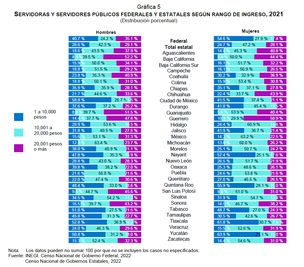 En Guerrero, 58.9 por ciento de servidoras públicas y 47.8 por ciento de servidores públicos tenían este nivel de remuneración.