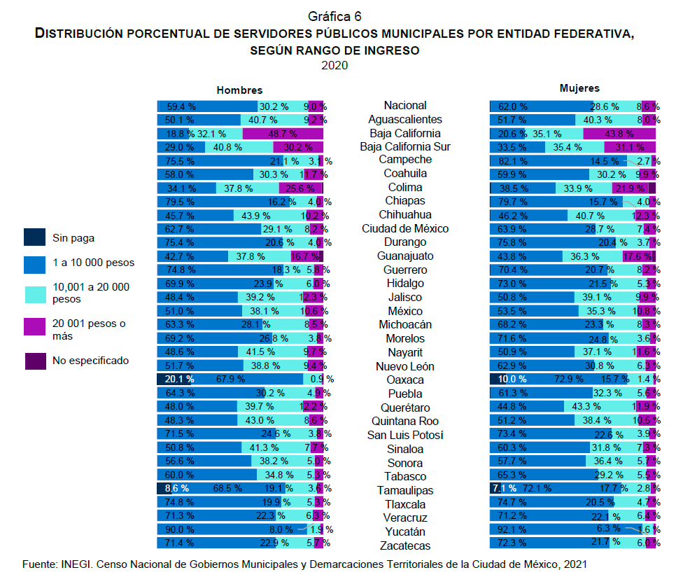 En los gobiernos municipales 62 por ciento de las servidoras públicas y 59.4 por ciento de los servidores públicos tuvieron ingresos menores a 10 000 pesos mensuales, en 2020. En este rango fue en el que se observaron las mayores diferencias entre mujeres y hombres, en especial, en los municipios de Nuevo León y Sinaloa. En estas entidades, 62.9 y 60.3 por ciento de las servidoras públicas y 51.7 y 50.8 por ciento de los servidores públicos, respectivamente, tenían ese nivel de remuneración.