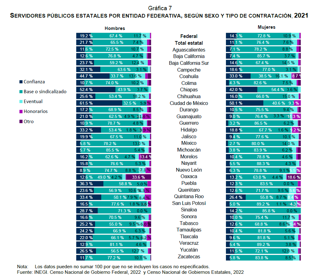 En todas las entidades, las mayores diferencias coincidieron en estos tipos de contratación: los porcentajes de servidoras públicas de base o sindicalizadas fueron elevados al igual que los porcentajes de hombres con contratos de confianza.