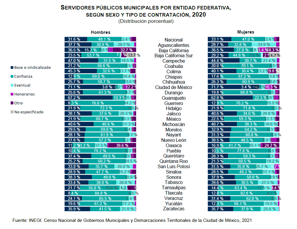 En los agregados estatales de las administraciones municipales, las mayores disparidades entre hombres y mujeres se encontraron en las contrataciones de base o sindicalizado y de confianza. En los municipios de Aguascalientes y Querétaro, se encontró que 37.7 y 37.4 por ciento de servidores públicos, respectivamente, eran de base o sindicalizados. Las mujeres bajo ese régimen de contratación representaron alrededor de 28 por ciento en ambas entidades.